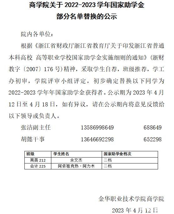 商学院关于2022-2023学年国家助学金 部分名单替换的公示